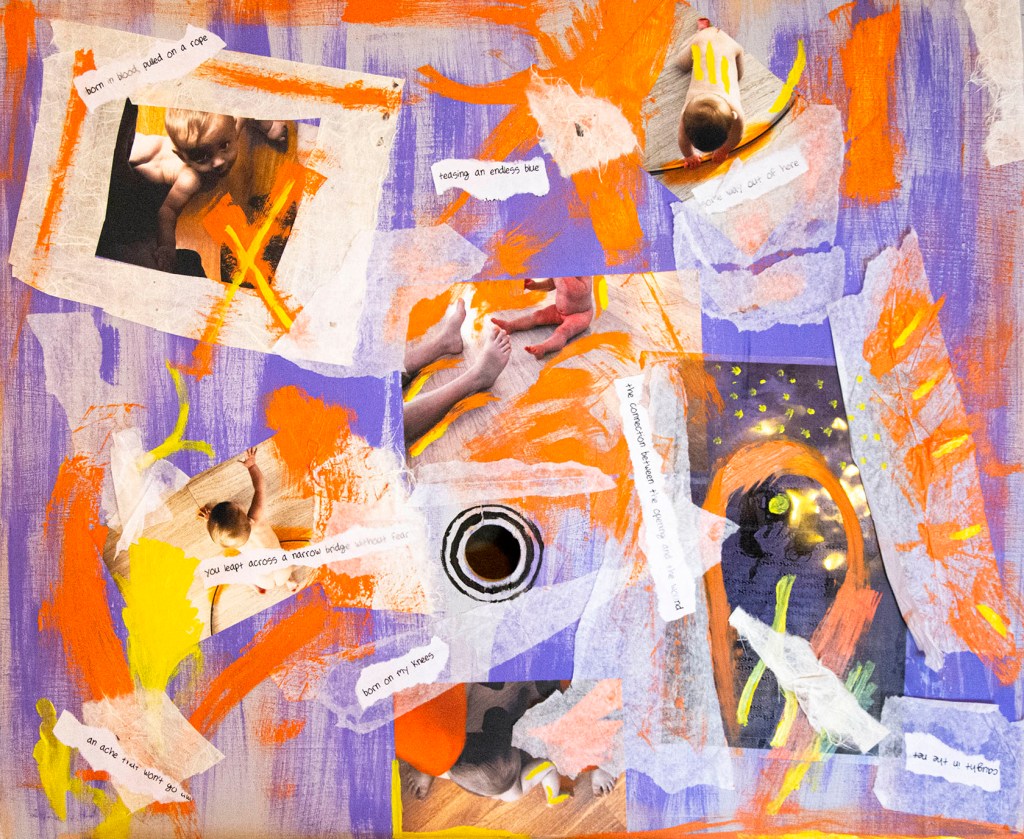 Face/Faceless multimedia paintingMonotype & photographic printMonotype & photographic printReduction relief print, based on a Pisces symbol from an Arab manuscript from the 14th century. Reduction relief print, based on a Pisces symbol from an Arab manuscript from the 14th century. Two pigs are friends in a magical landscape…Unexpected Encounters: CollageBased on a Tibetan Thangka, this resurrection wheel is made of bones and butterflies.Up close detail of “Resurrection Wheel”Paper collage.Deconstructed Hamsa: EyeDeconstructed Hamsa: Hand